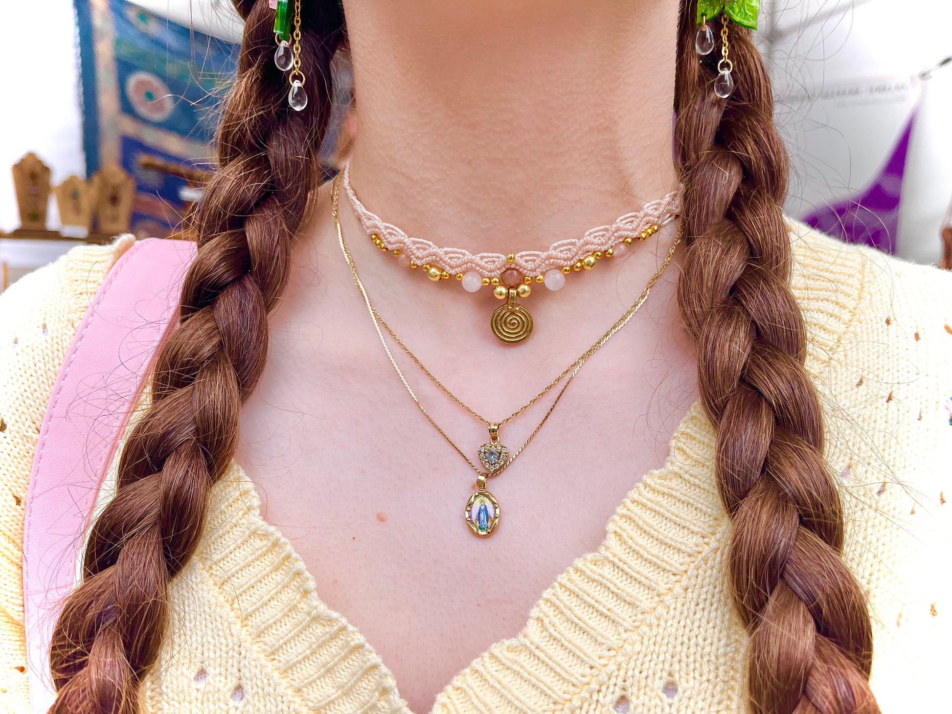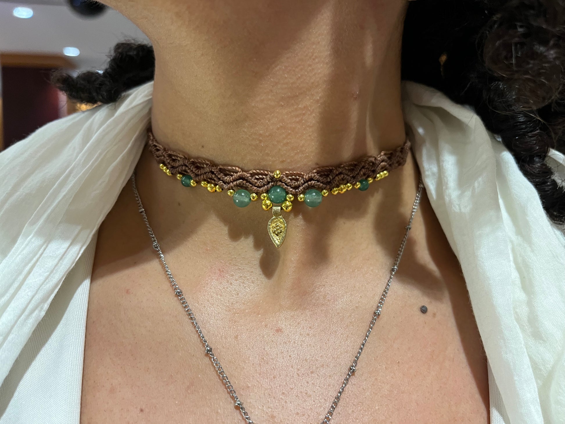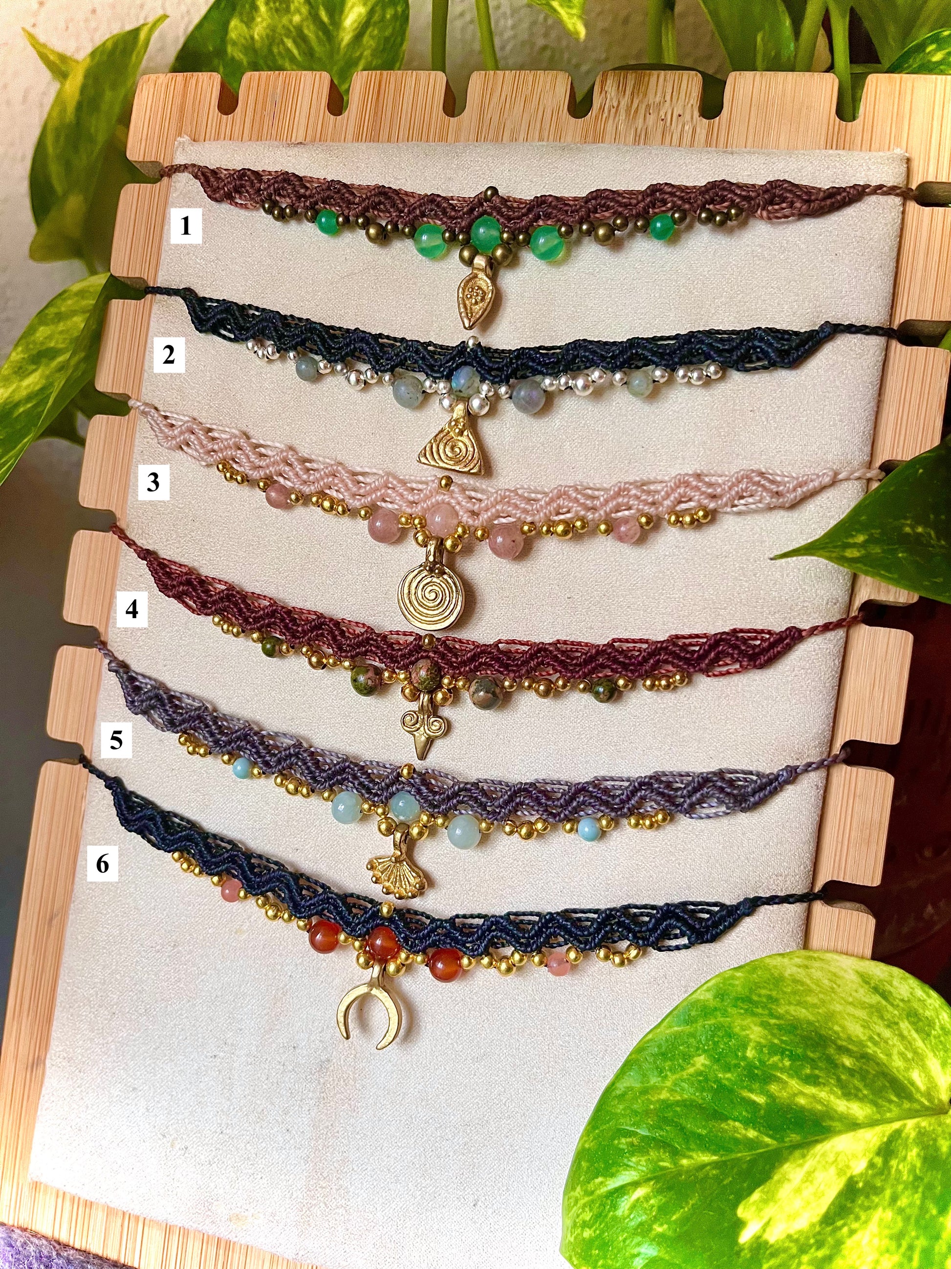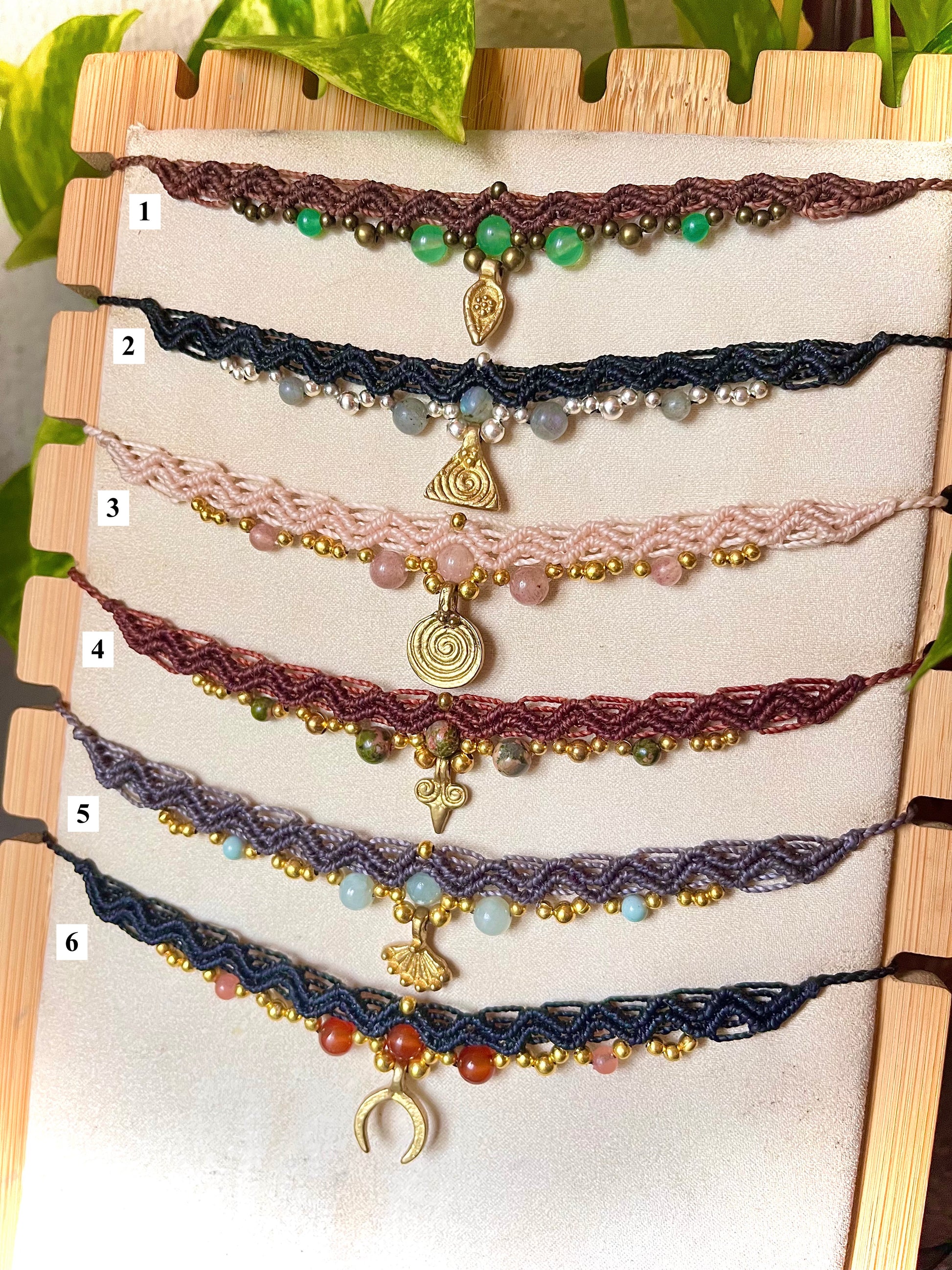 Intricate macrame chokers, featuring charms, genuine stone beads and waxed cotton cord!
